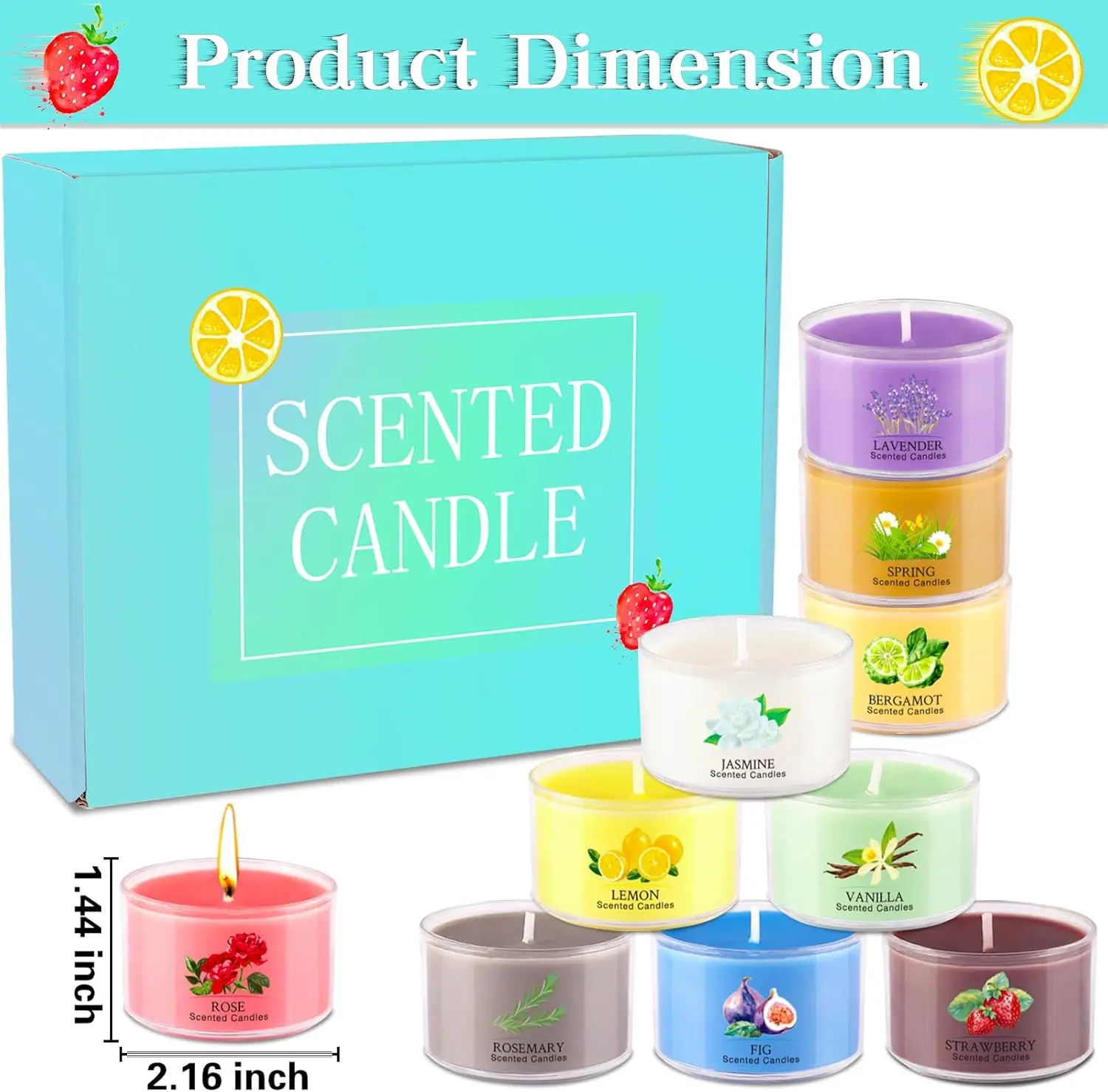 This candle set features 10 carefully selected scents paired with distinct colored wax, creating a visual and olfactory delight: Lavender, Vanilla, Strawberry, Bergamot, Fig, Spring, Rosemary, Jasmine, Rose, and Lemon (2 candles per scent). Each aroma is tailored to enhance mood, relieve stress, and foster a serene atmosphereâperfect for meditation, unwinding after work, or setting a cozy vibe at home.